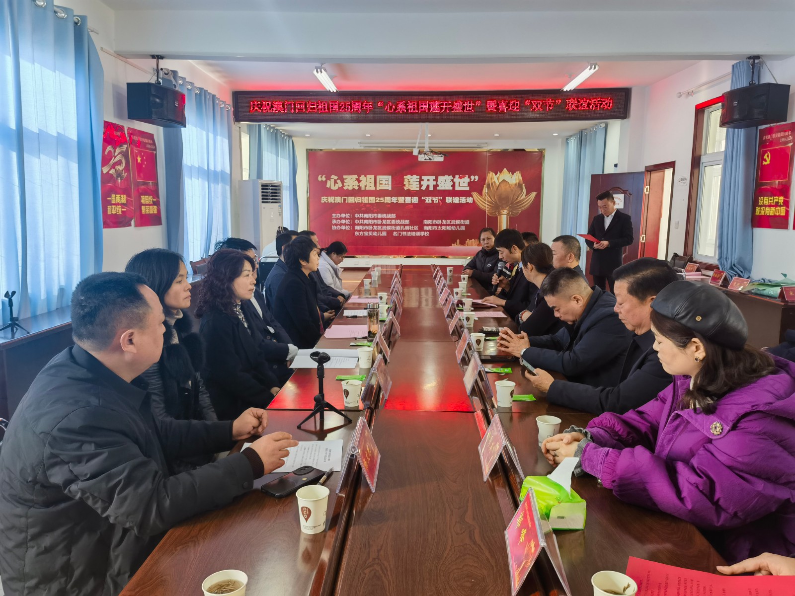 12月20日,值澳门回归祖国25周年且双节临近之际,南阳市委统战部举办“心系祖国 莲开盛世”联谊活动,市委统战部副部长、市台办主任、市政府港澳办主任任平,市侨联主席余卫华,卧龙区委副书记、统战部长金键及港澳台侨人士代表等出席,共庆澳门回归,喜迎双节。