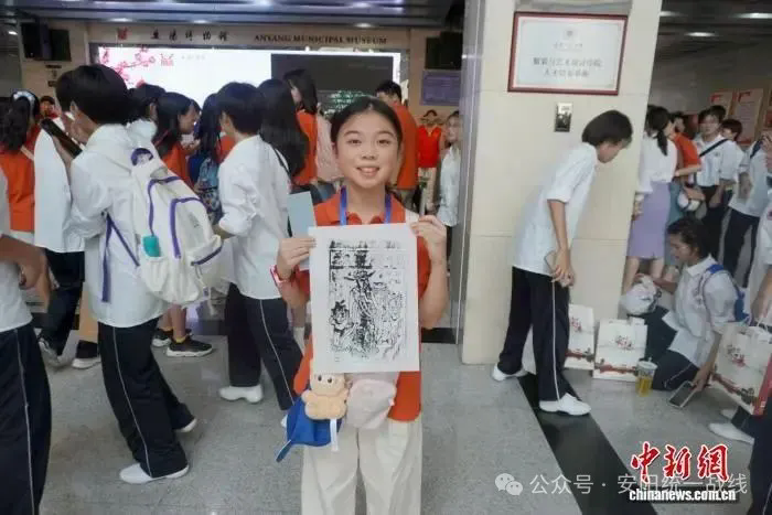 7月19日,第八届全球华语朗诵大赛河南集结营在安阳博物馆开营。来自葡萄牙、加拿大、西班牙、澳大利亚、缅甸、英国、德国等7个国家的38名师生赴豫参访交流。开营当日,海外华裔青少年在安阳博物馆体验拓印技艺,和当地学生分享成长故事。图为海外华裔青少年展示版画拓印作品。 张楠 摄