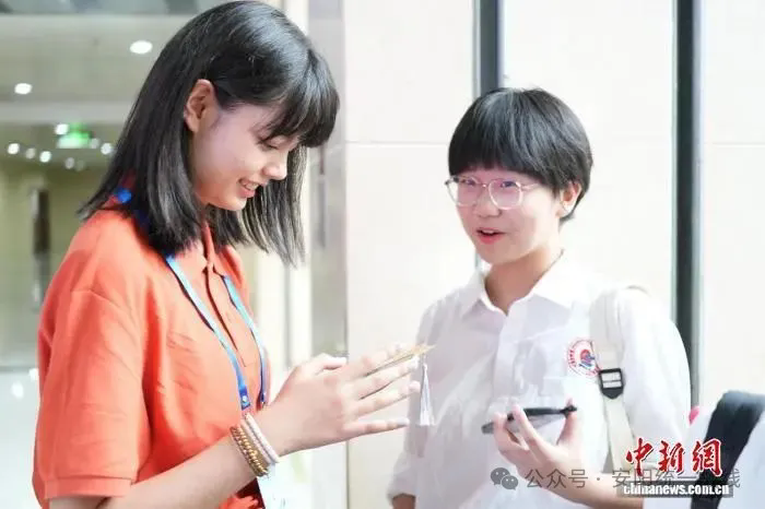 7月19日,第八届全球华语朗诵大赛河南集结营在安阳博物馆开营。来自葡萄牙、加拿大、西班牙、澳大利亚、缅甸、英国、德国等7个国家的38名师生赴豫参访交流。开营当日,海外华裔青少年在安阳博物馆体验拓印技艺,和当地学生分享成长故事。图为海外华裔青少年与河南学生交换联系方式。连晨宇 摄