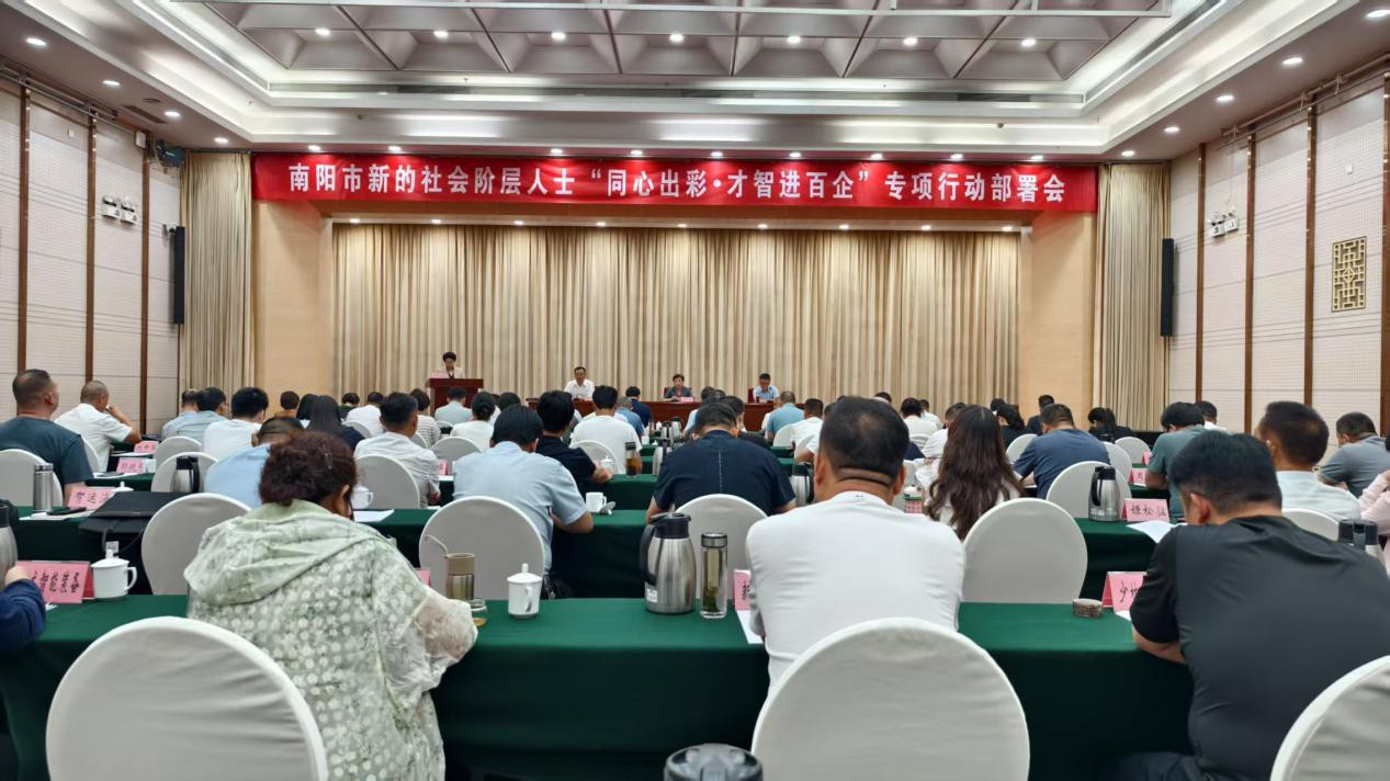 会议传达学习了省委统战部、省工商联《关于印发<河南省新的社会阶层人士“同心出彩·才智进千企”专项行动实施方案>的通知》精神,印发了《南阳市新的社会阶层人士“同心出彩·才智进百企”专项行动实施方案》,举行了 “三师”服务团代表授旗仪式。