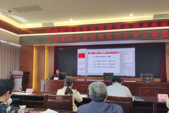 在此次讲堂上,市委统战部新的社会阶层人士统战工作科科长李明克、离退休干部工作科科长孟洪超分别以“新的社会阶层人士统战工作概述”“《中国共产党统一战线工作条例》解读”为题作了分享与交流。