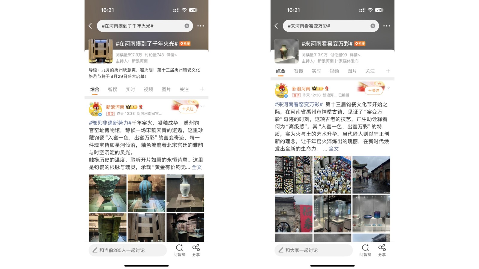 截止9月28日12时,相关话题阅读量2583万+,#豫见非遗新势力# 1538.4万、#在河南摸到了千年火光# 596.3万、#来河南看窑变万彩# 312.6万,其中#来河南看窑变万彩# 冲顶同城榜第一,#在河南摸到了千年火光#同城第三。