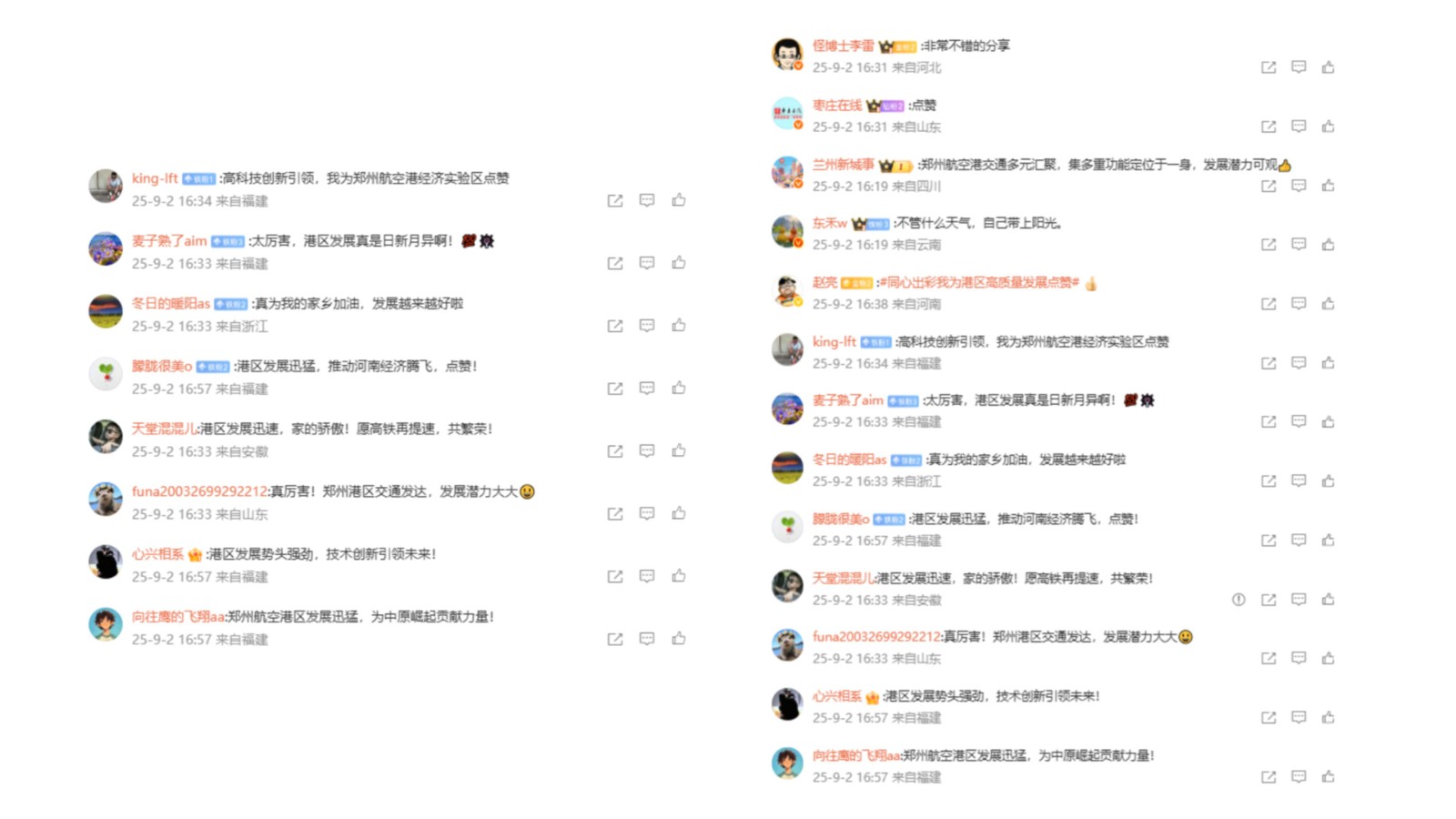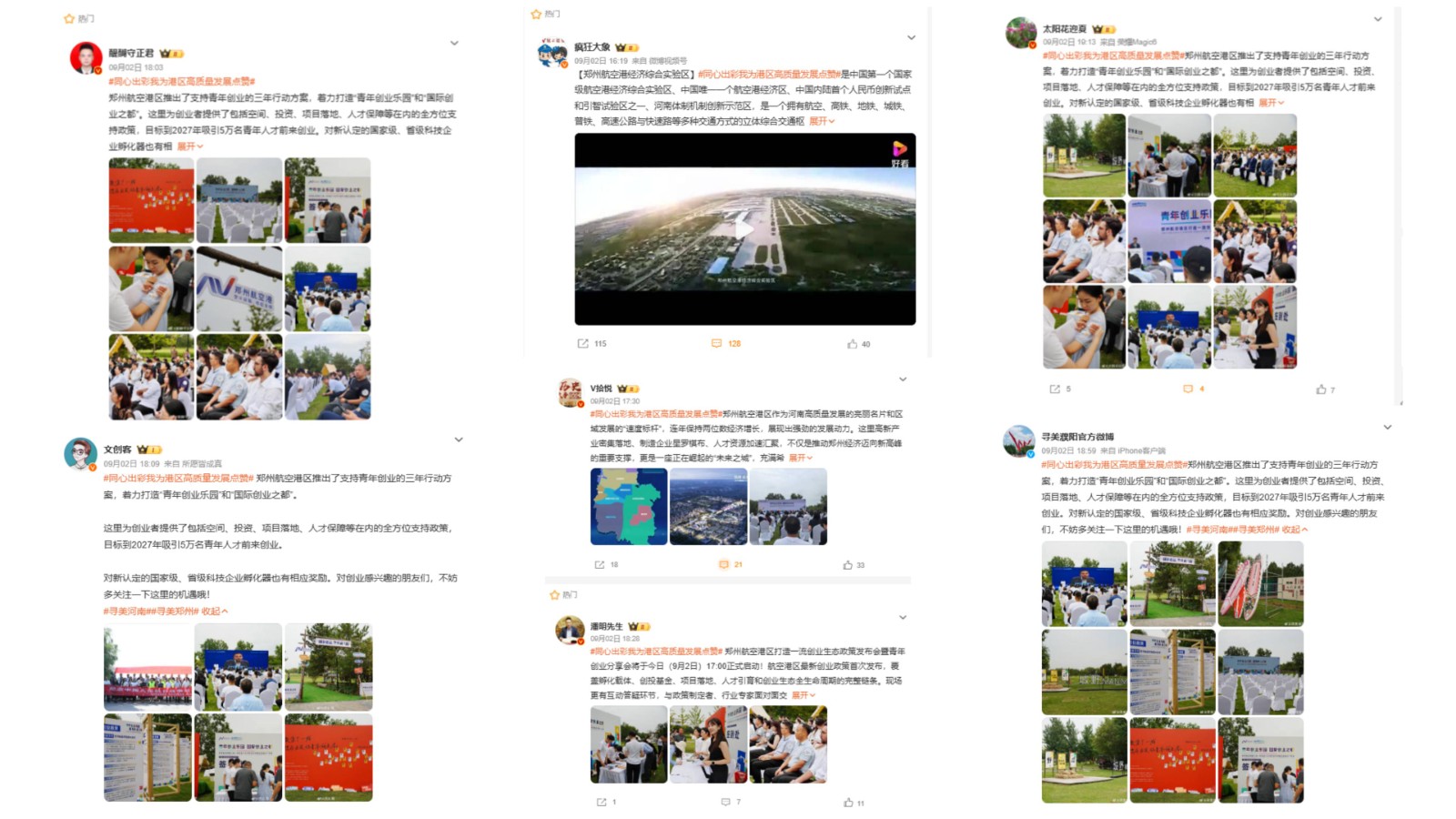 截至9月3日12时,微博大V、寻美矩阵账号、省市媒体、新浪河南矩阵账号等共同联动,现场图文+视频实时输出,产出62条优质博文,助力#同心出彩˙我为港区高质量发展点赞#、#郑州航空港区创业大礼包来了#双话题登录微博热搜榜,相关阅读量超4200万。