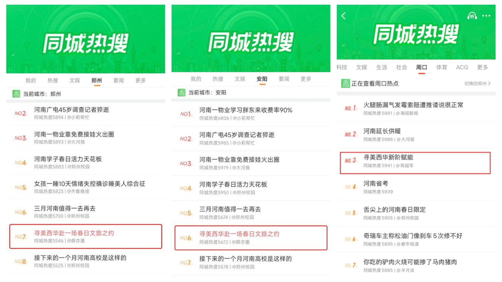 网络达人现场实时输出图文及短视频,打造了“寻美西华赴一场春日文旅之约”“寻美河南西华篇”“寻美西华新阶赋能”三大话题矩阵。截至活动收官,话题总阅读量达5015.7万。其中,#寻美西华赴一场春日文旅之约#阅读量1272.4万,冲上全省18地市热搜榜;#寻美河南西华篇#阅读量2092.9万与#寻美西华新阶赋能#阅读量1650.4万在预热期、活动日及启动后相关话题多次登上同城热搜榜。活动累计产出优质博文100余条,推动西华文旅品牌提质升级,为县域高质量发展贡献了“新阶层˙建设力”。