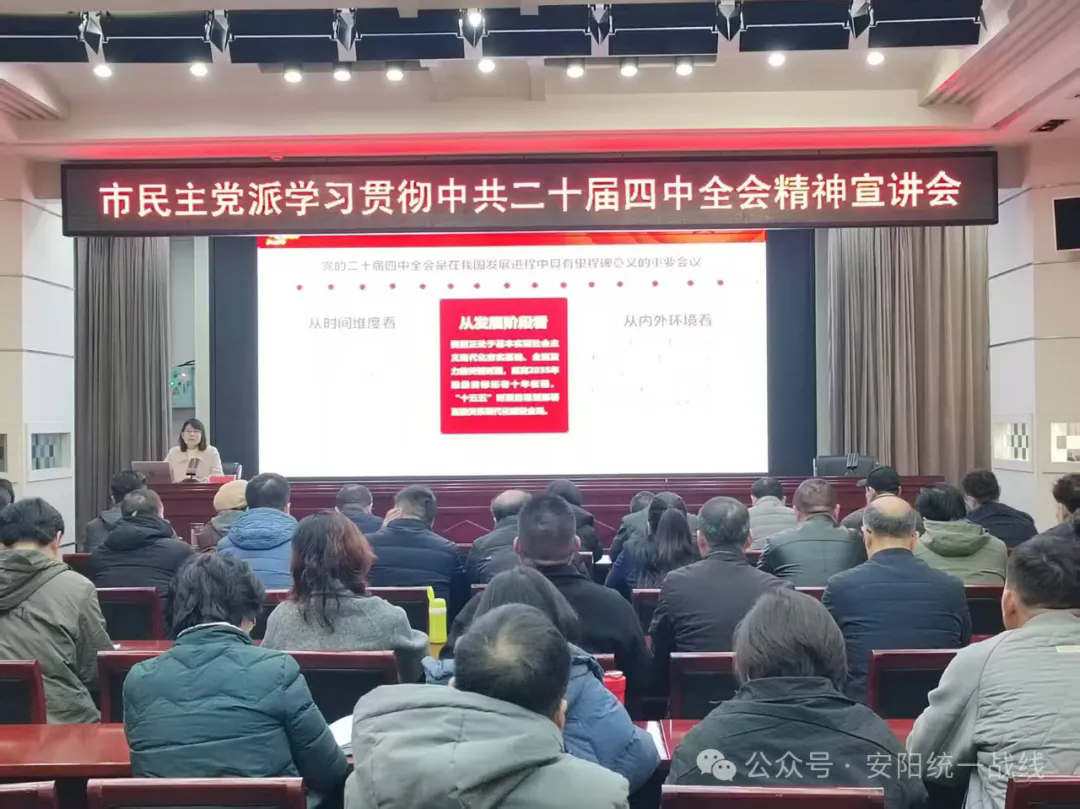 近日,安阳市各民主党派召开学习贯彻中共二十届四中全会精神宣讲会,邀请市委宣讲团成员、市委党校中国特色社会主义理论教研部主任、副教授聂喜玲作专题宣讲。各民主党派市委会委员、基层支部主委等参会。