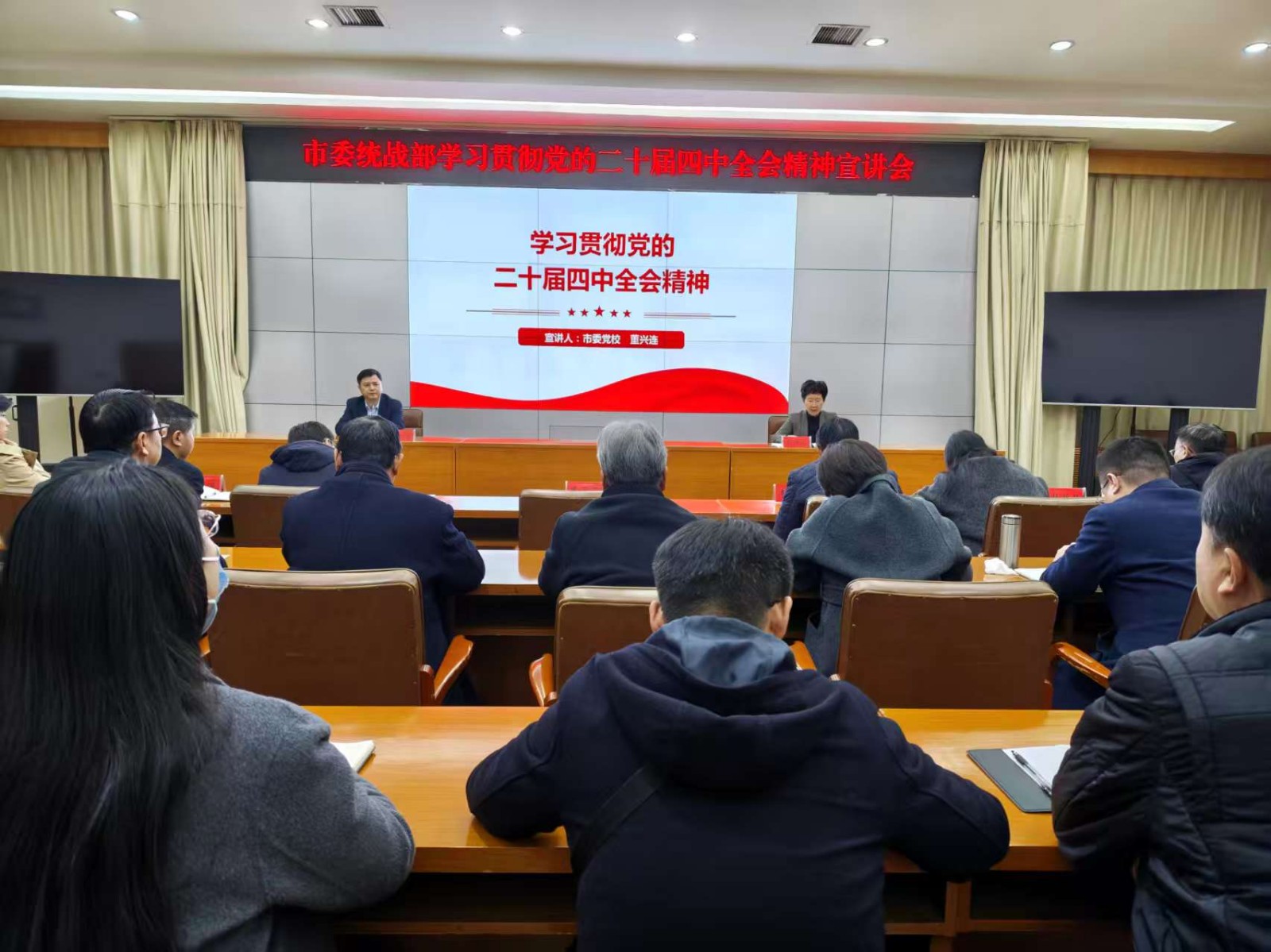 12月9日,市委统战部举办学习贯彻党的二十届四中全会精神宣讲报告会,市委宣讲团成员、市委党校党委书记、常务副校长董兴连作专题宣讲。市委统战部常务副部长崔飞飞主持会议,市委统战部、市侨联、各民主党派市委会机关干部及全市统一战线各领域代表人士参加。