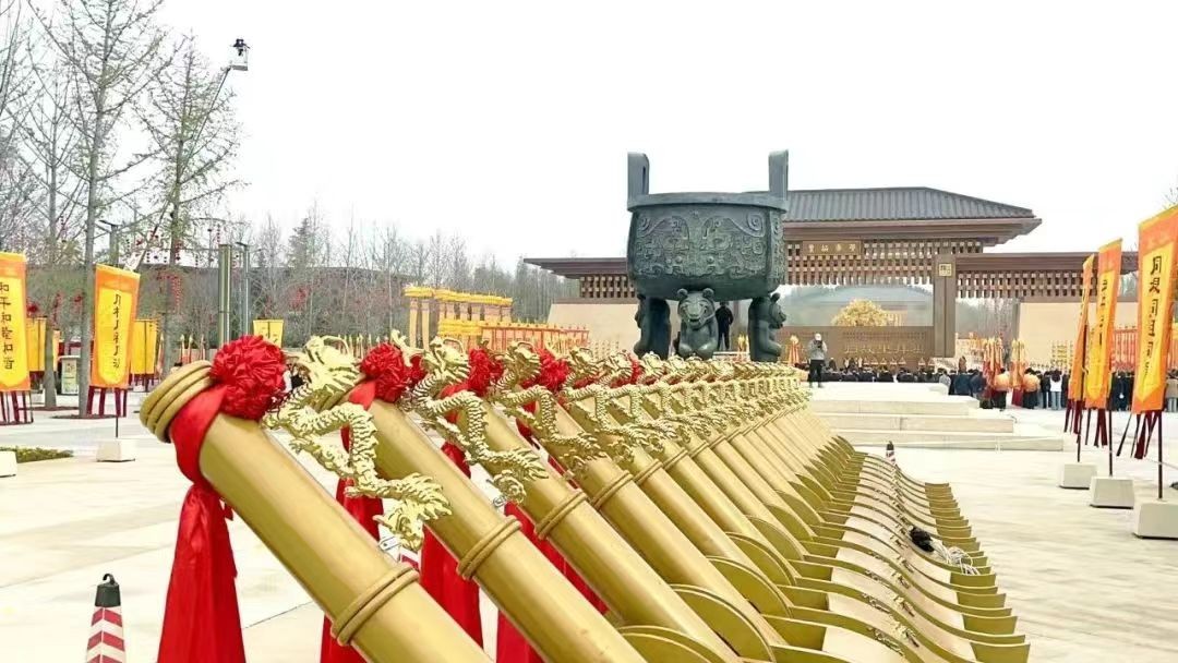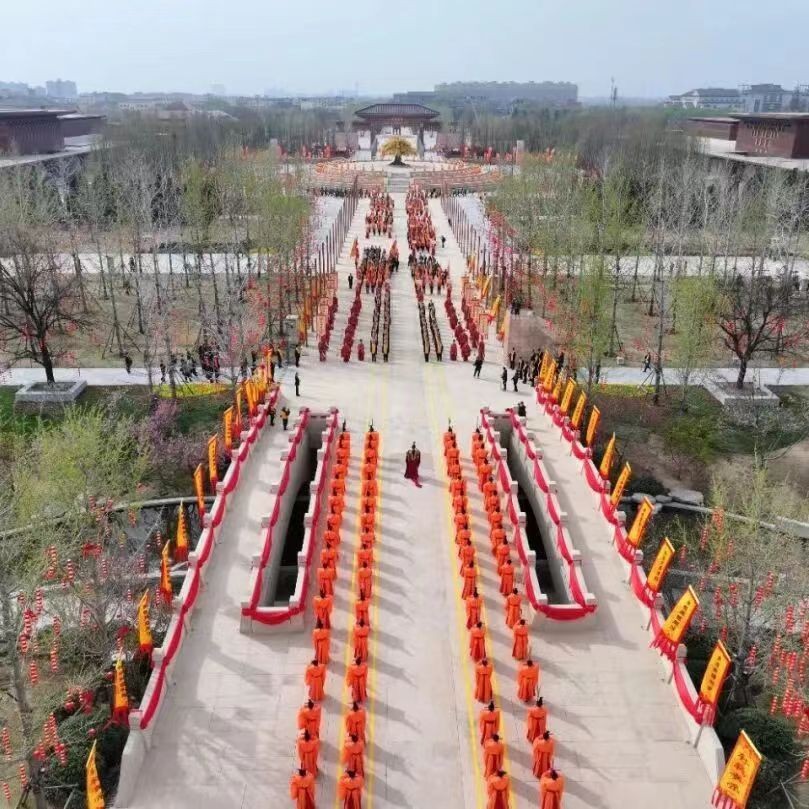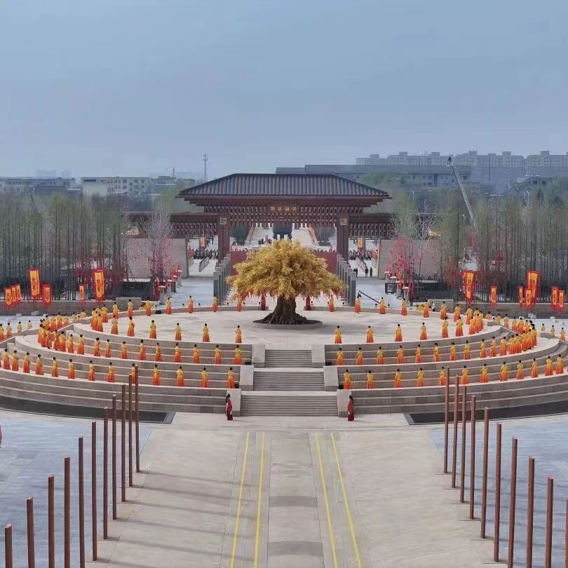 黄帝故里园区庄严肃穆,寻根门前,文化方阵、岐黄方阵、台胞方阵、侨胞方阵、企业方阵、同拜方阵六大拜祖队伍如群星列阵,每个方阵都由90人组成,一共540位同胞,象征着华夏儿女来自五湖四海。他们整肃衣冠,佩戴黄帝丝巾,经寻根门、登系祖坛、上轩辕桥、过故里祠,在石碑镌刻的《史记·黄帝本纪》中探寻文明之源,在“同根树”上挂满的祈福丝带中感触四海同心的深情,在肃穆威仪的八佾舞中体味华夏礼乐的气度,一步一步丈量着五千多年的流转时光,饱览着五千多年的文明长卷。