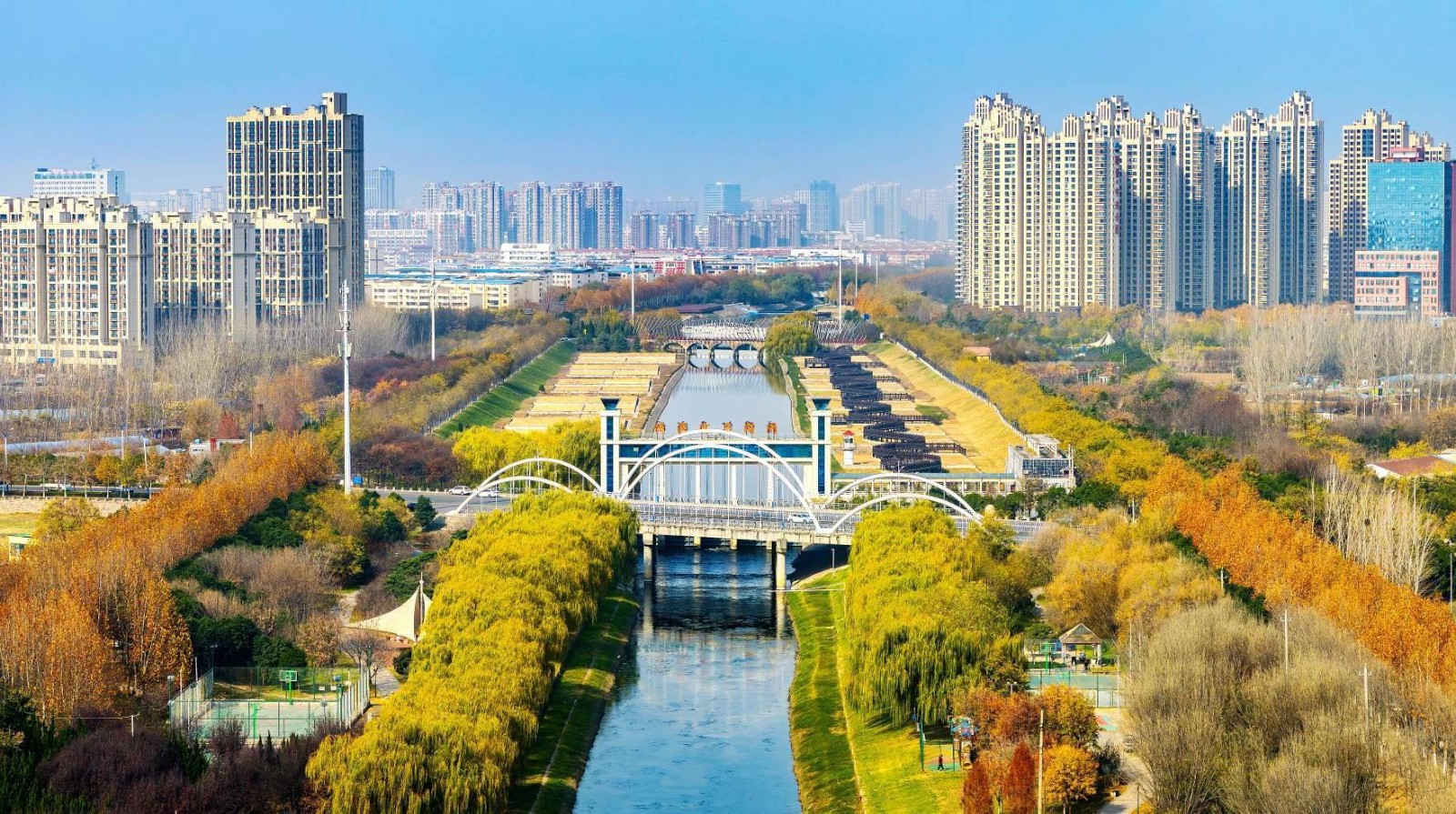 月5日,冬日暖阳照在许昌市区清潩河上,河水碧波粼粼,两岸树木斑斓,与鳞次栉比的现代楼宇相映成趣。