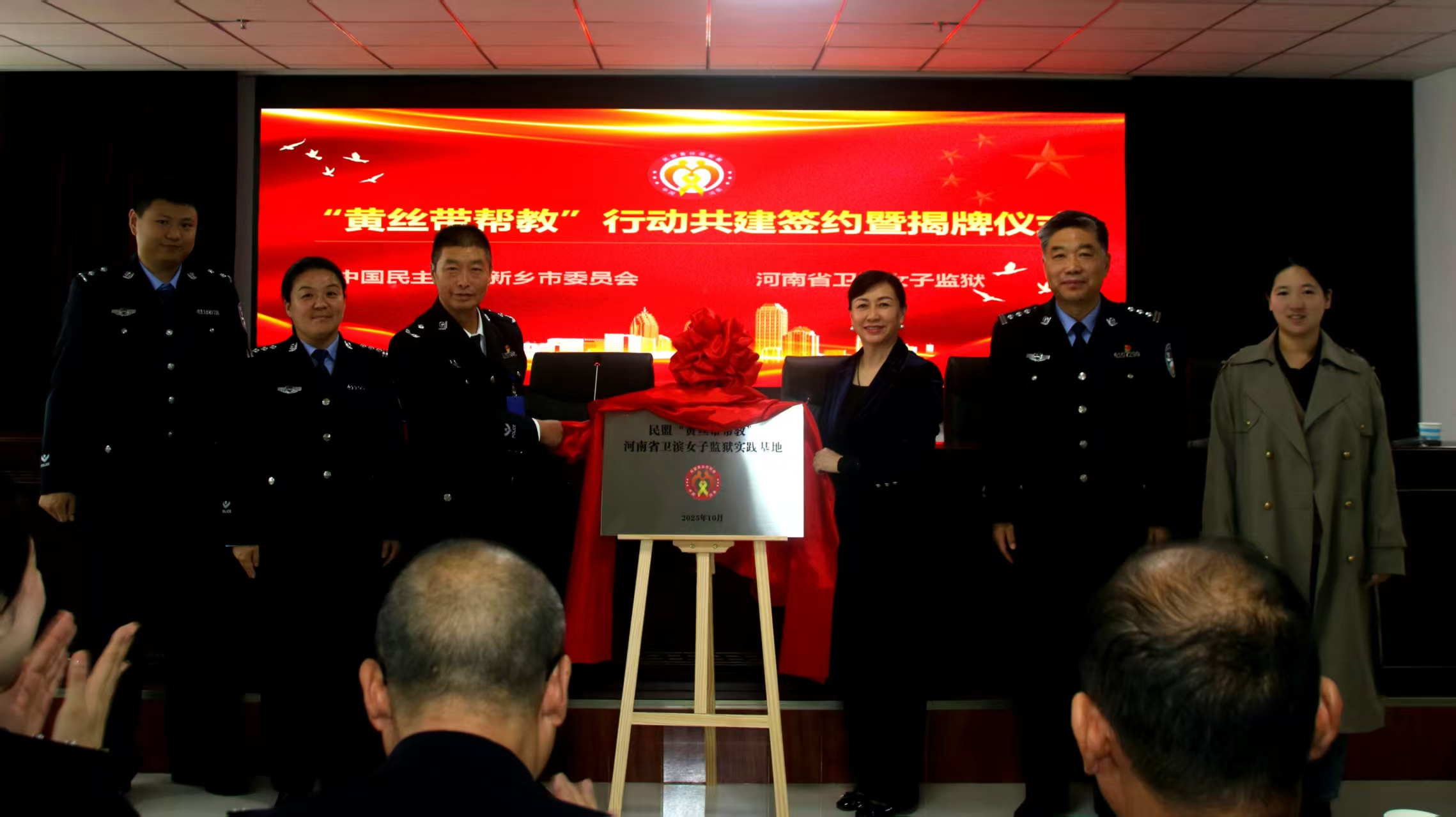 省卫滨女子监狱党委书记、监狱长陈军敬致辞,介绍了监狱罪犯帮扶帮教工作开展情况;王海燕宣读了《民盟新乡市委员会 河南省卫滨女子监狱进一步推进“黄丝带帮教”工作实施方案》;王海燕与陈军敬签订了“黄丝带帮教”行动共建协议书,并共同为民盟新乡市委会“黄丝带帮教”河南省卫滨女子监狱实践基地揭牌。揭牌仪式由省卫滨女子监狱党委副书记、政委王飞主持。