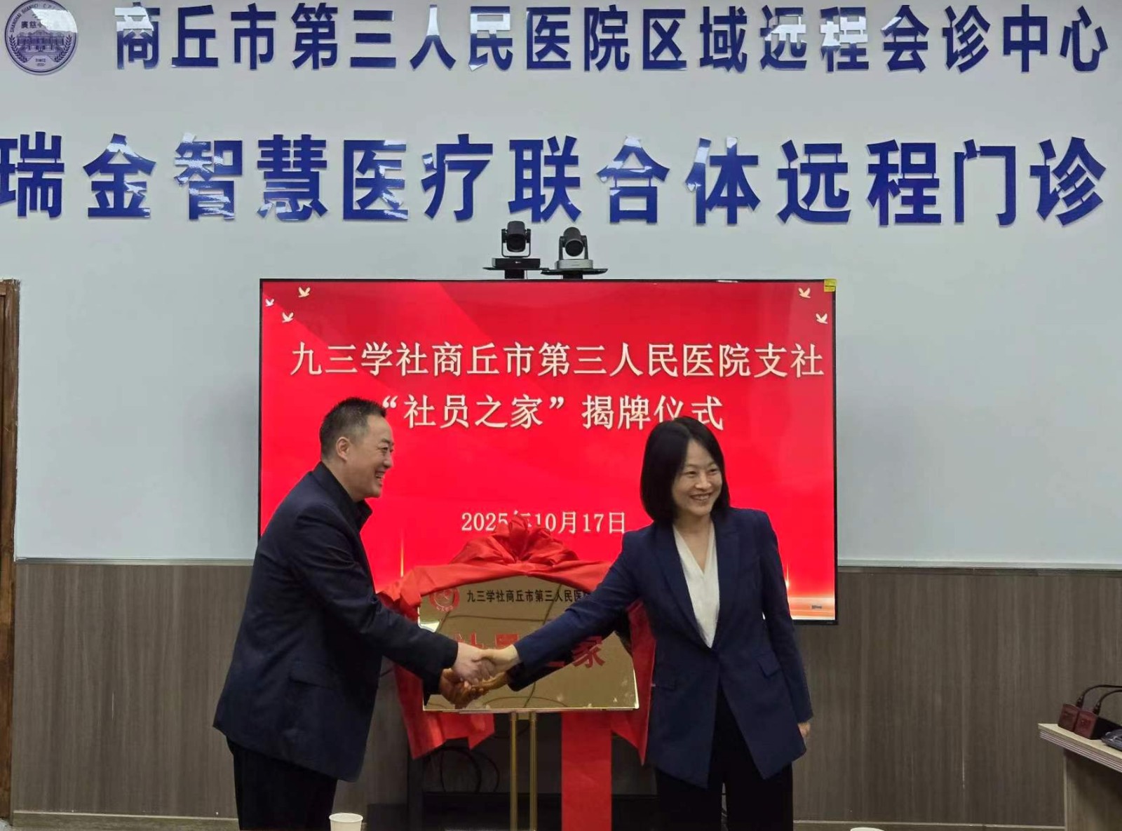 为进一步夯实基层组织建设根基,提升组织凝聚力、向心力与战斗力,10月17日,九三学社商丘市第三人民医院支社“社员之家”揭牌仪式在商丘市第三人民医院隆重举行。商丘市人民政府副市长、九三学社商丘市委会主委王爱林出席仪式并致辞。九三学社商丘市委会秘书长王卫平,梁园区委常委、统战部部长陈允璨,商丘市第三人民医院党委书记王孝峰等出席仪式。