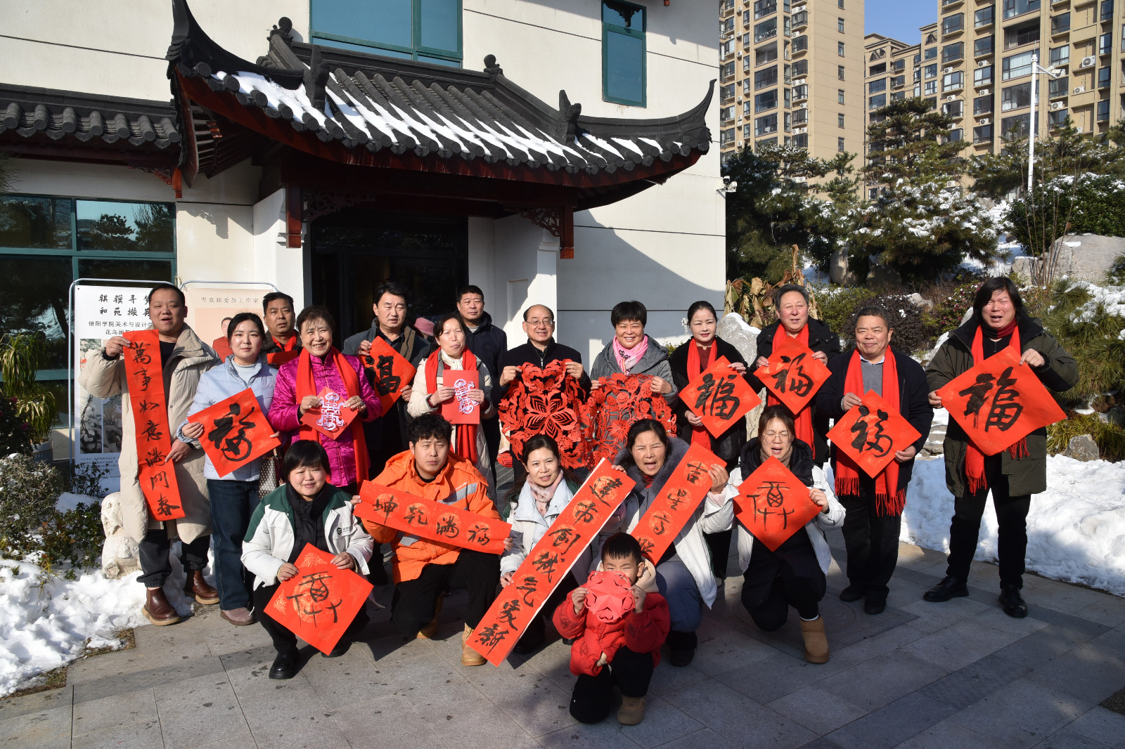 活动现场,墨香四溢,纸韵传情。书法老师们挥毫泼墨、笔走龙蛇,一副副寓意吉祥、充满喜庆的大红春联和“福”字灵动潇洒,承载着对新年美好生活的期盼与祝愿。与此同时,剪纸老师们将普通的红纸变幻成栩栩如生的窗花、“寿”字以及各种吉祥纹样,这些作品既有传统韵味又充满时代气息,精巧的技艺令人赞叹。社区居民们接过满载祝福的作品,感受到了新春的喜悦,更体会到了党委政府以及社会各界的关怀。