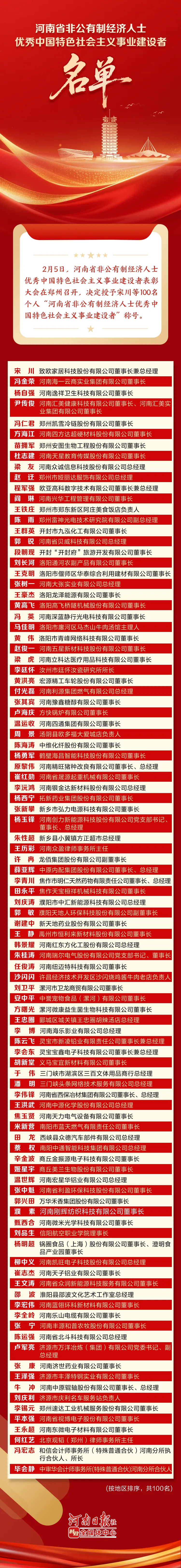 为表彰先进、树立典型,进一步激励我省广大非公有制经济人士坚定理想信念、保持发展定力、勇担时代重任,凝聚起团结奋进的强大力量,中共河南省委统战部、河南省工业和信息化厅、河南省人力资源和社会保障厅、河南省市场监督管理局、河南省工商业联合会决定,授予宋川等100名个人“河南省非公有制经济人士优秀中国特色社会主义事业建设者”称号。