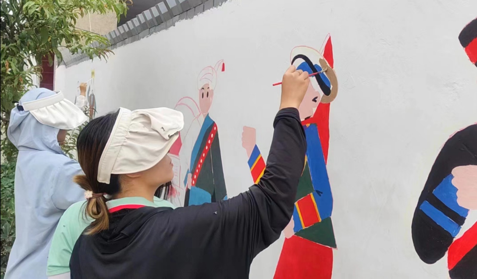 “石榴同心乡村行,青春描绘振兴梦”暑期实践队深入袁庄村,同学们以铸牢中华民族共同体意识为主题创作墙绘作品,通过一幅幅乡村墙绘展现中华民族优秀传统文化、各民族多彩生活面貌和丰富文化形态,精美的墙体彩绘作品既美化了乡村环境,也营造了民族团结进步的良好氛围。