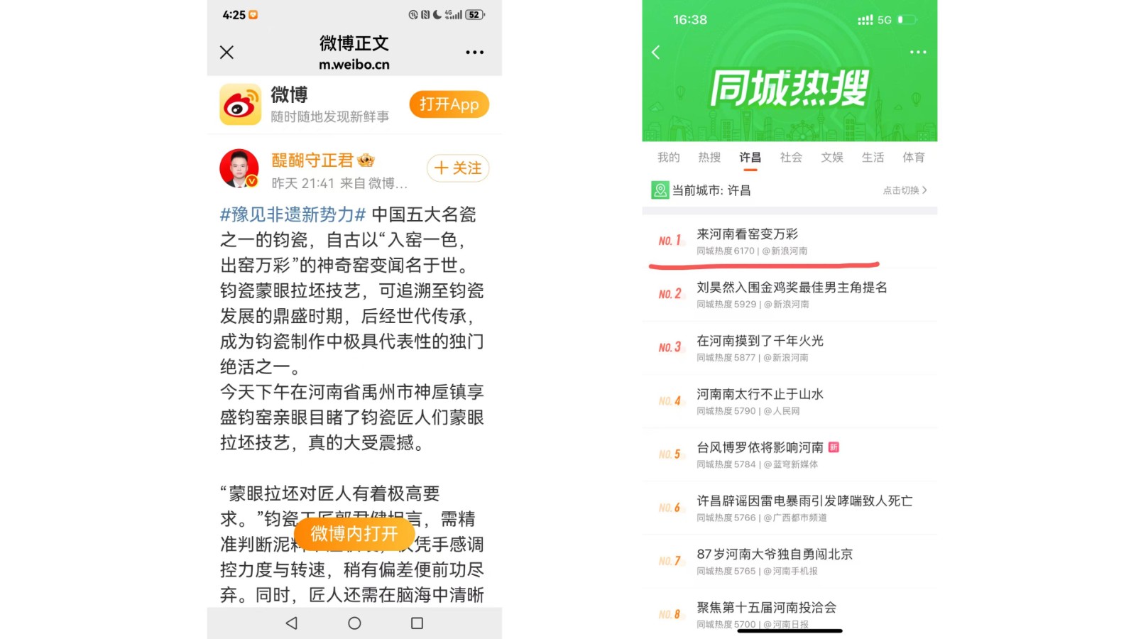 截止9月28日12时,相关话题阅读量2583万+,#豫见非遗新势力# 1538.4万、#在河南摸到了千年火光# 596.3万、#来河南看窑变万彩# 312.6万,其中#来河南看窑变万彩# 冲顶同城榜第一,#在河南摸到了千年火光#同城第三。