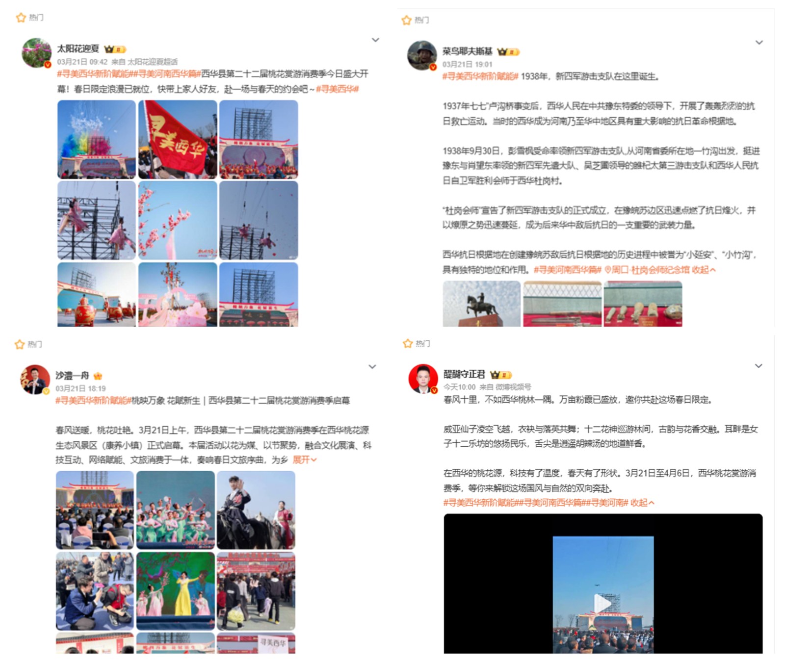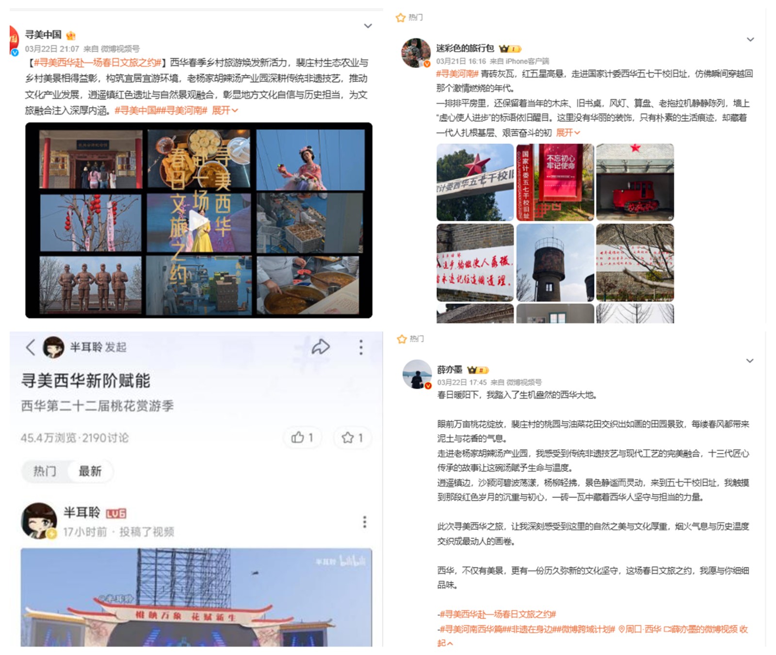 网络达人现场实时输出图文及短视频,打造了“寻美西华赴一场春日文旅之约”“寻美河南西华篇”“寻美西华新阶赋能”三大话题矩阵。截至活动收官,话题总阅读量达5015.7万。其中,#寻美西华赴一场春日文旅之约#阅读量1272.4万,冲上全省18地市热搜榜;#寻美河南西华篇#阅读量2092.9万与#寻美西华新阶赋能#阅读量1650.4万在预热期、活动日及启动后相关话题多次登上同城热搜榜。活动累计产出优质博文100余条,推动西华文旅品牌提质升级,为县域高质量发展贡献了“新阶层˙建设力”。