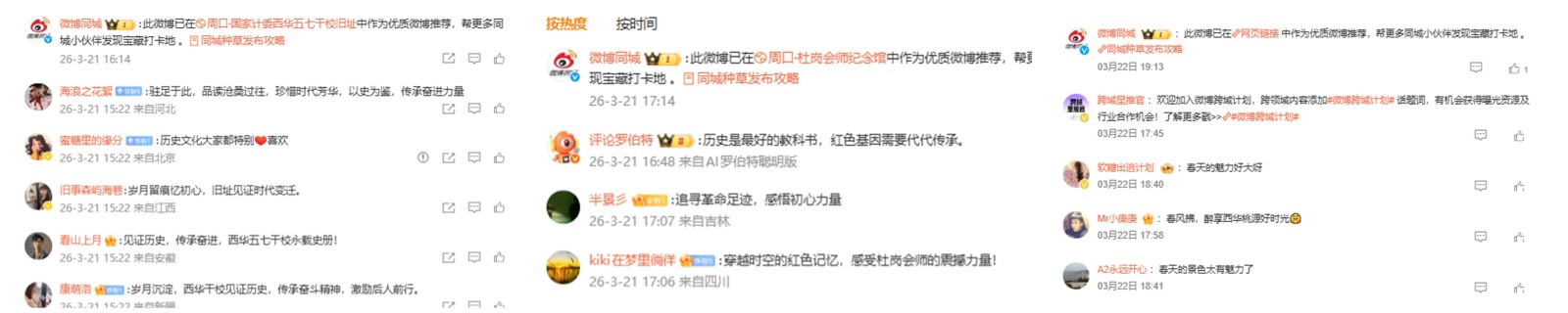 官微@微博同城将西华桃花节活动列为同城优质活动,在平台大力推荐,河北网友发表评论:“春天魅力太大了,太喜欢这样生机勃勃的场景”网友@寻美河南发表评论:“历史是最好的教科书,红色基因需要代代传承。”来自新疆网友@康萌洛发表评论:“岁月沉淀,西华五七干校见证历史,传承奋斗精神,激励后人前进。”