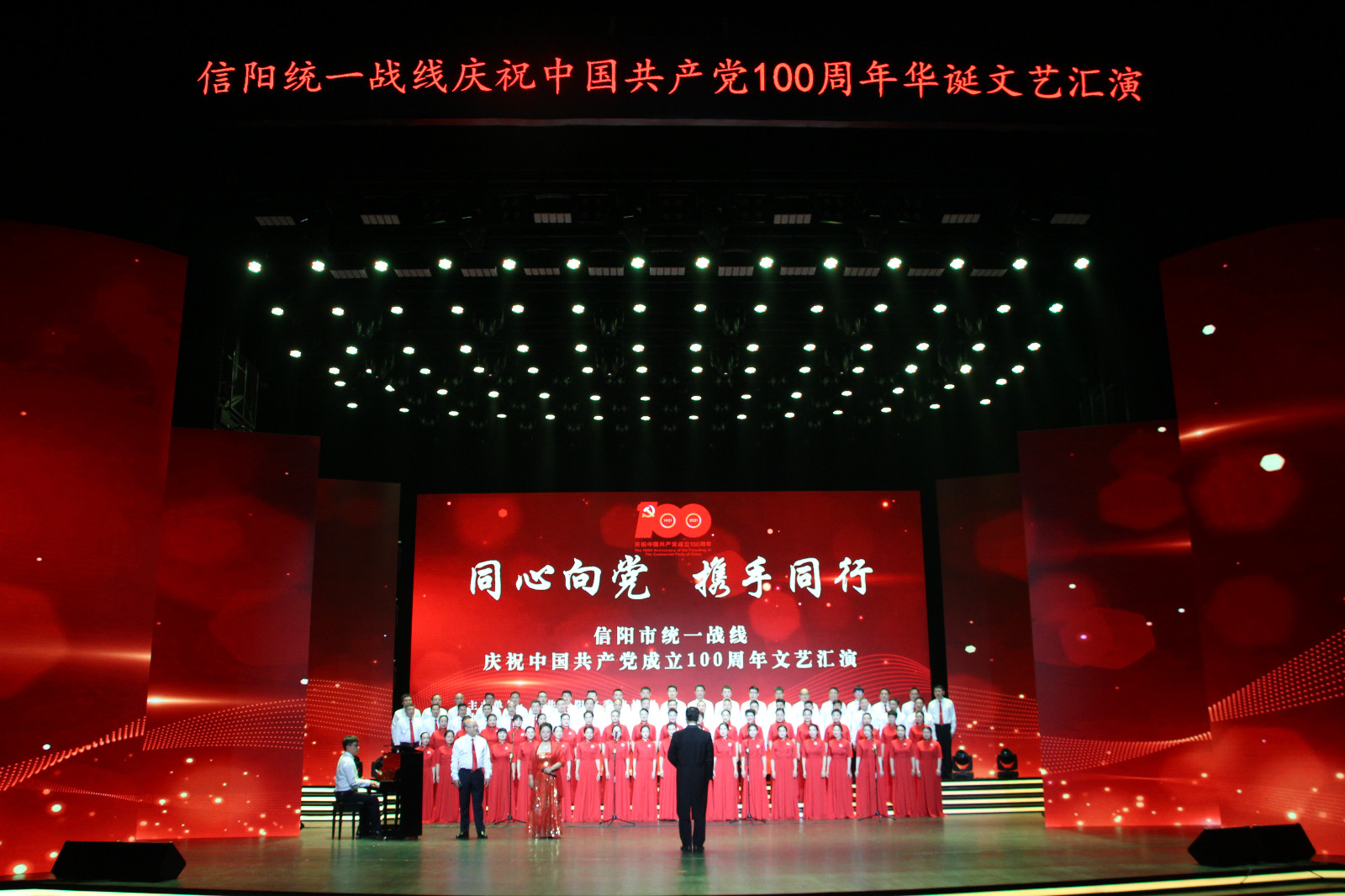 “唱支山歌给党听,我把党来比母亲……”6月29日下午,伴随着市直统战系统合唱队深情的歌声,以“同心向党 携手同行”为主题的全市统一战线庆祝中国共产党成立100周年文艺汇演在信阳市广电演播中心精彩上演。