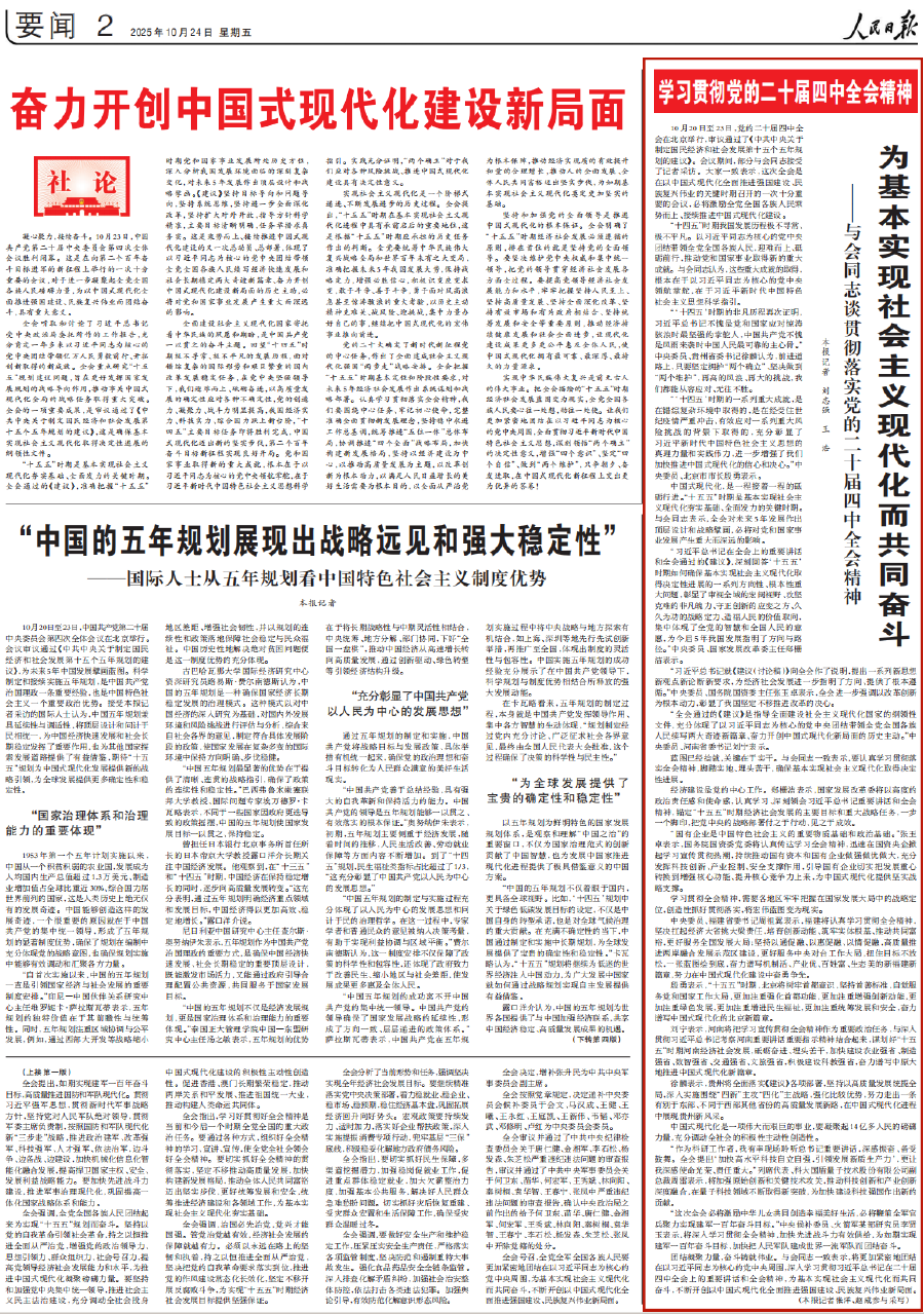 10月20日至23日,党的二十届四中全会在北京举行,审议通过了《中共中央关于制定国民经济和社会发展第十五个五年规划的建议》。会议期间,部分与会同志接受了记者采访。大家一致表示,这次全会是在以中国式现代化全面推进强国建设、民族复兴伟业的关键时期召开的一次十分重要的会议,必将激励全党全国各族人民乘势而上、接续推进中国式现代化建设。